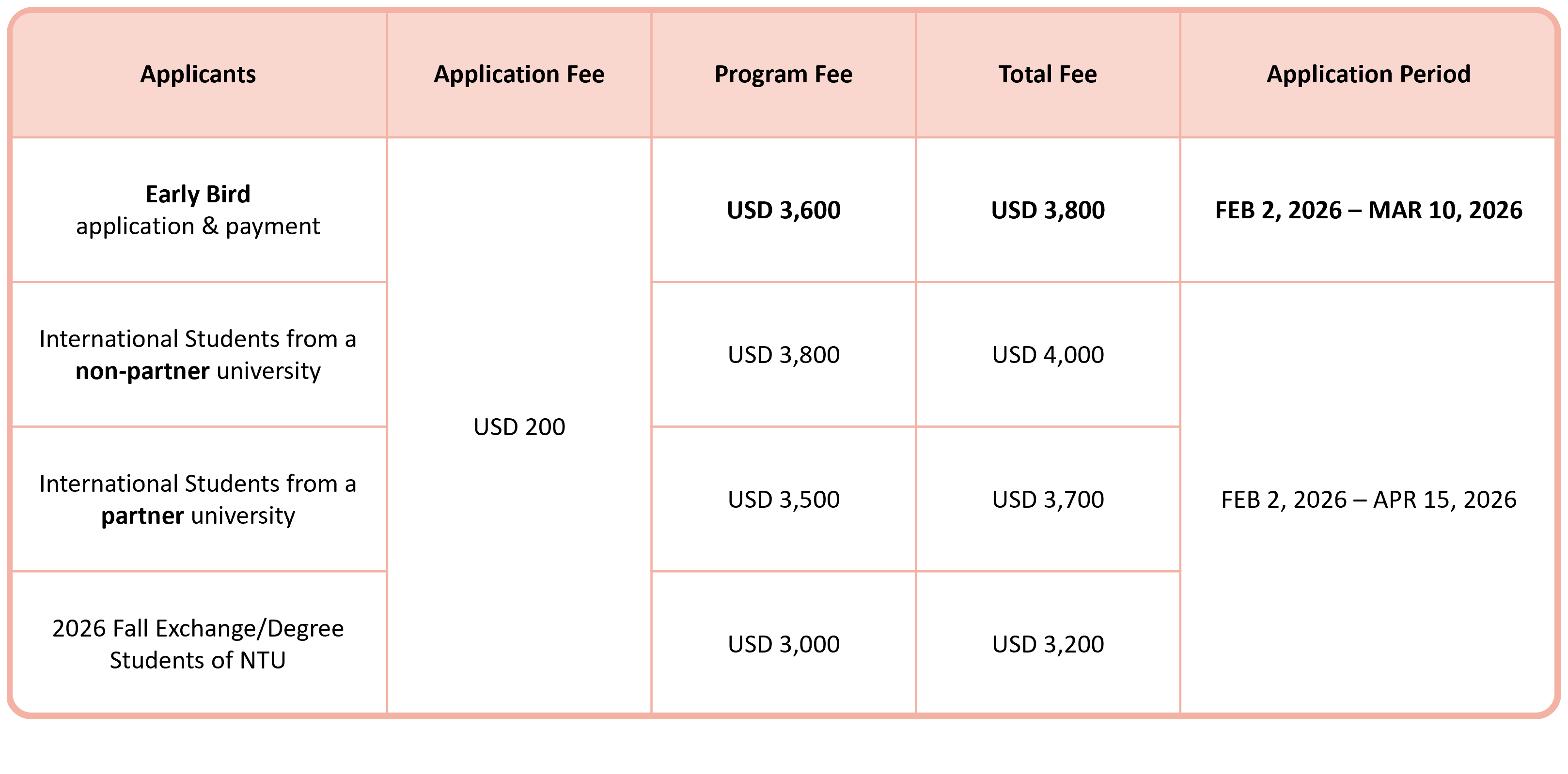 *Upon successful completion of the program, participants will receive an academic transcript with 7 NTU short-term program credits. If they wish to have their credits approved, they should consult their home institutions and credit advisors in advance.